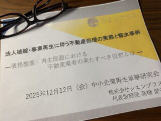 今回の講演タイトルは、『法人破綻・事業再生に伴う不動産処理の実態と解決事例~ 債務整理・再生局面で「不動産業者が果たすべき役割」とは ~』。この日はNPO法人としての活動ではなく、私が日々取り組んでいる「事業再生の現場における不動産業者」という立場から、実際の現場で起きている課題や、解決に至った事例、再生局面において不動産業者が果たすべき役割についてお話しさせていただきました。