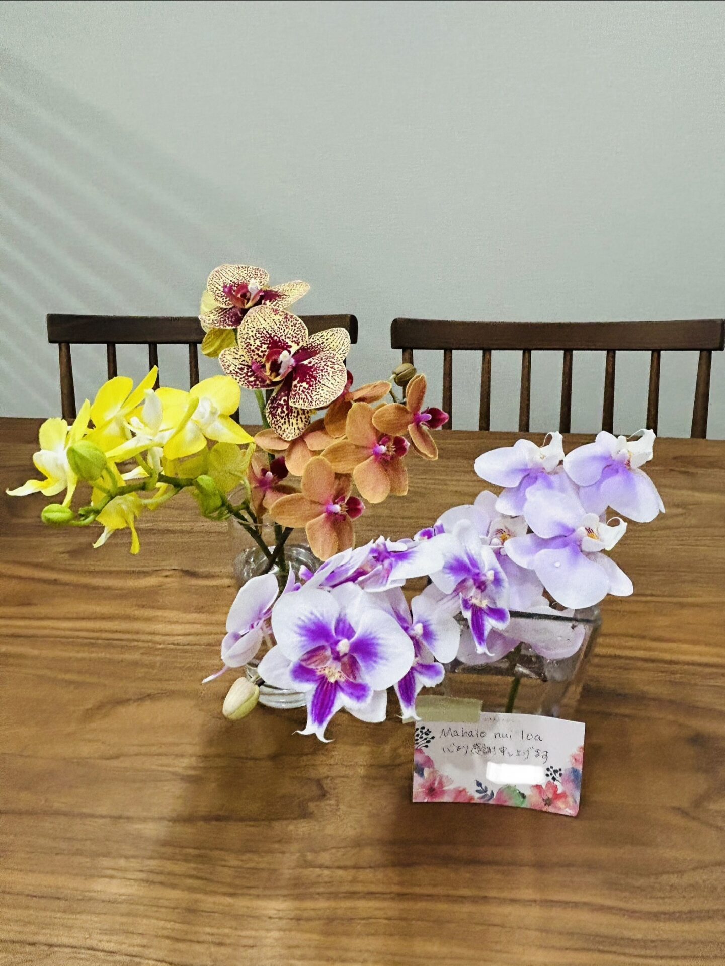 その相談者の方から、後日、御礼にと色とりどりの胡蝶蘭をいただきました。鉢植えでいただくことはありますが、こんなに多彩な種類があるんですね! 応接のテーブルに飾ったところ一気に華やいで、とても和やかな気持ちになりました。添えてくださったカードには、「Mahalo nui loa(マハロ・ヌイ・ロア)」とハワイ語で「本当にありがとう」という感謝の言葉が書かれていました。